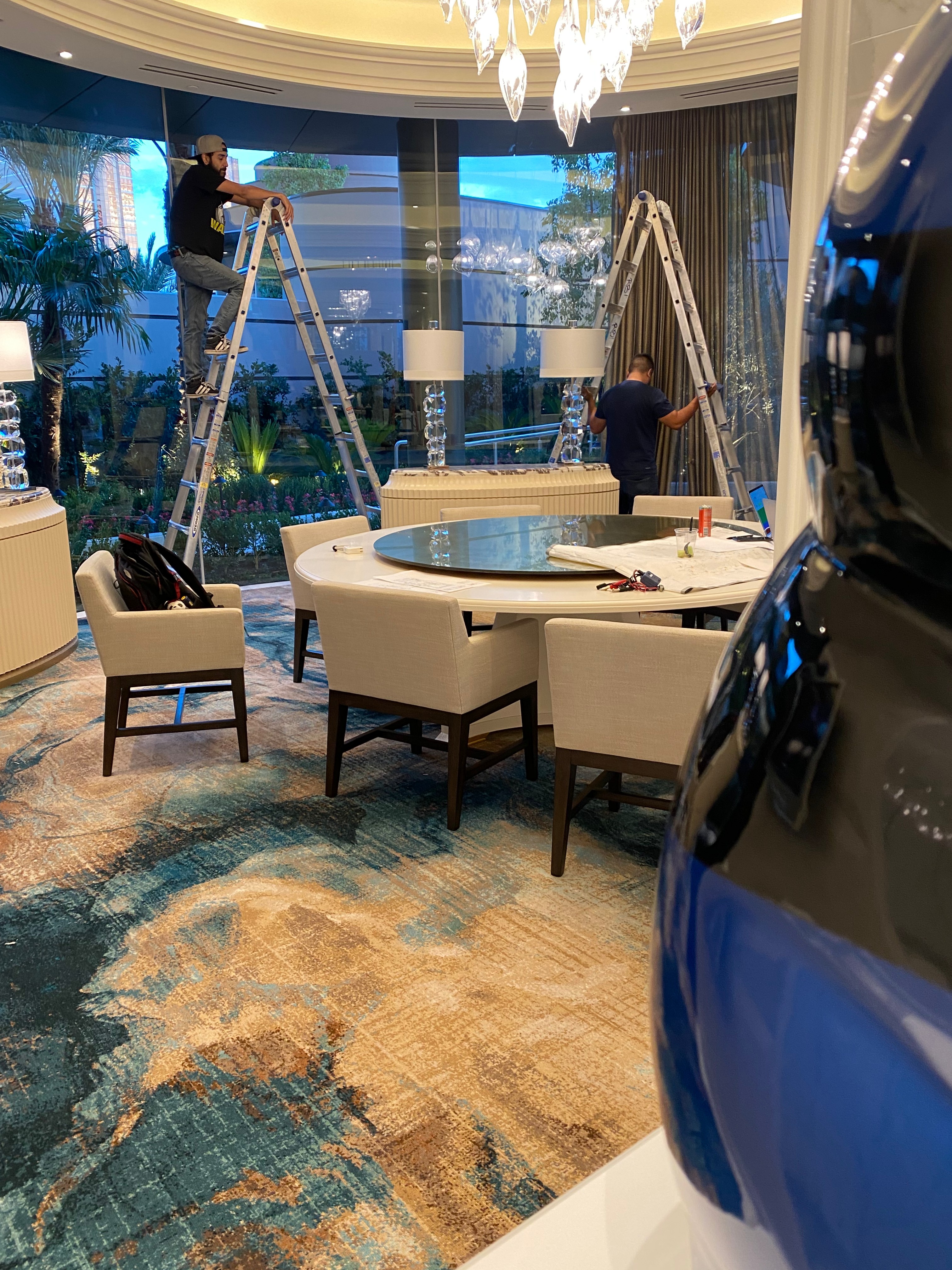 On the east side of the living room is the dining area, on the west, television and gorgeous pool table. It’s ridiculous that I even use “east” and “west” to describe a hotel room but these proportions justify it. Its elliptical shape aside, the floor plan is an exact copy of Wynn’s largest villas. With that in mind, I’m estimating this room (which is one of the smaller of the three Palaces) is a minimum 7000 square feet.