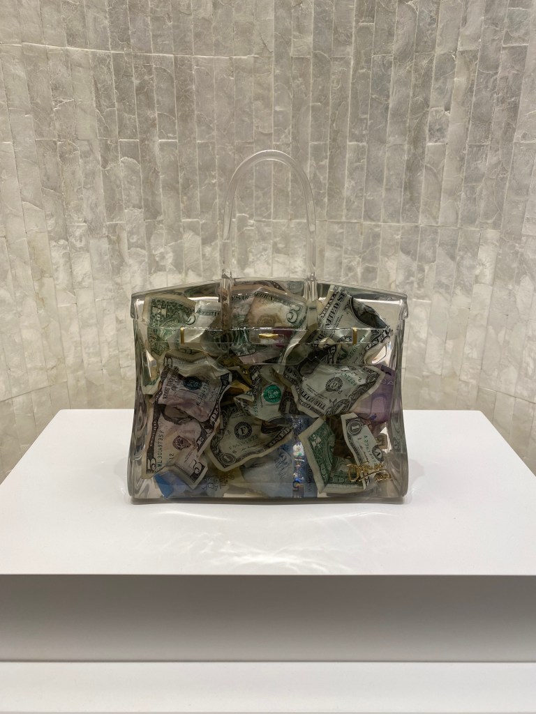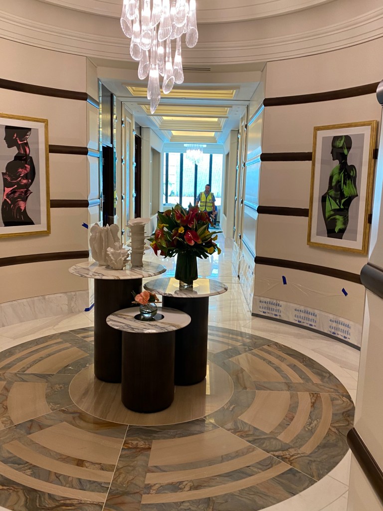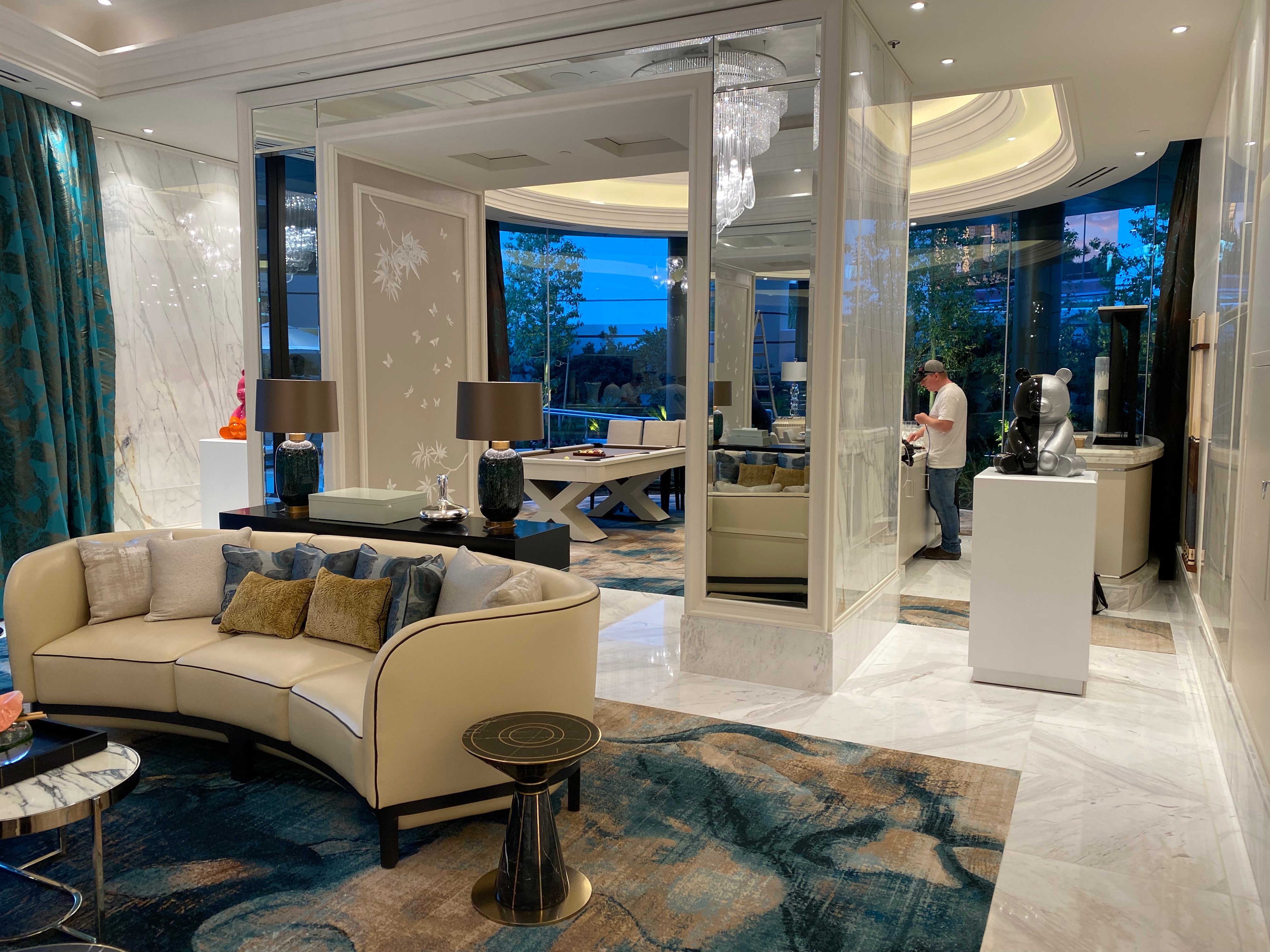 The Palace is loaded with colorful, contemporary art. Surrounding the entry door are two crystal Hermès Birkin bags, one filled with colorful glass butterflies, the other, real money.