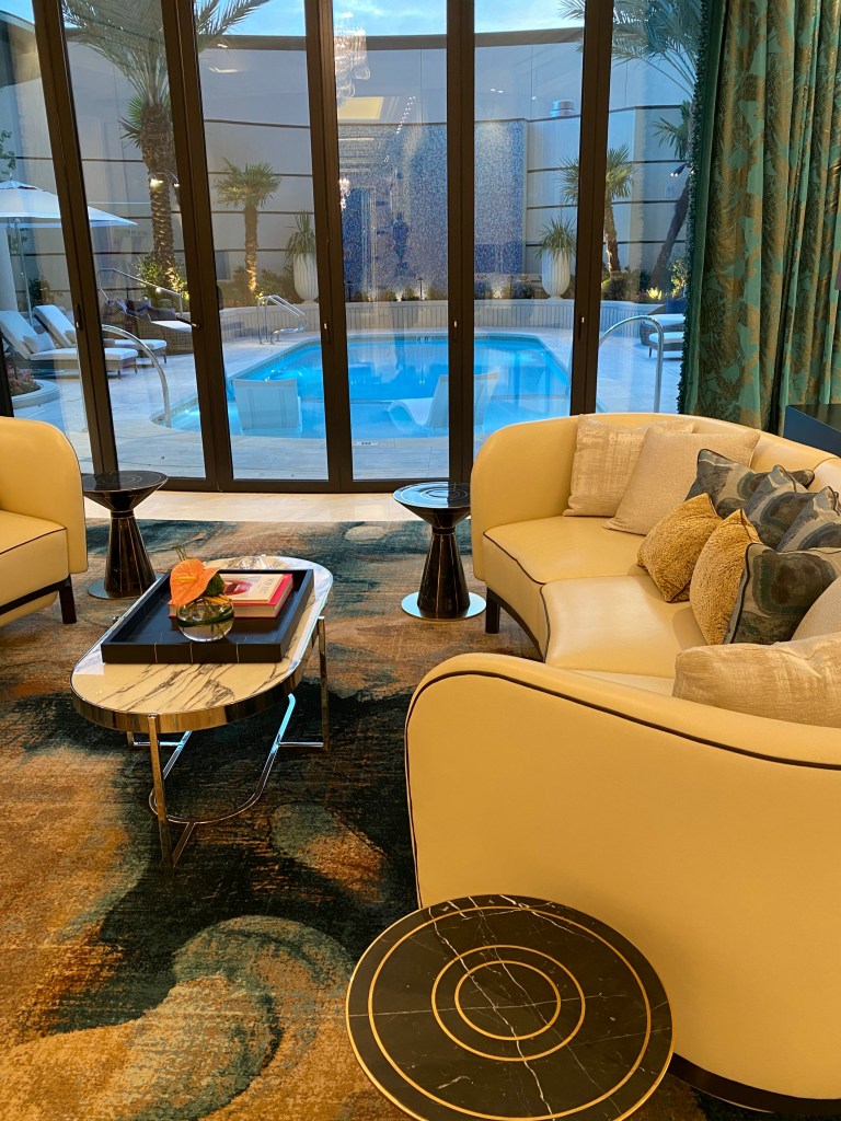 Walking deeper into the Palace passed a guest bathroom and media room, I entered the massive living area. Two symmetrical, curved sofas heighten the elliptical shape of the space. The backyard has massive walls conveying a sense of fortified privacy (though the outdoor areas are visible to all south-facing guest rooms). The giant water feature against the wall is spectacular.