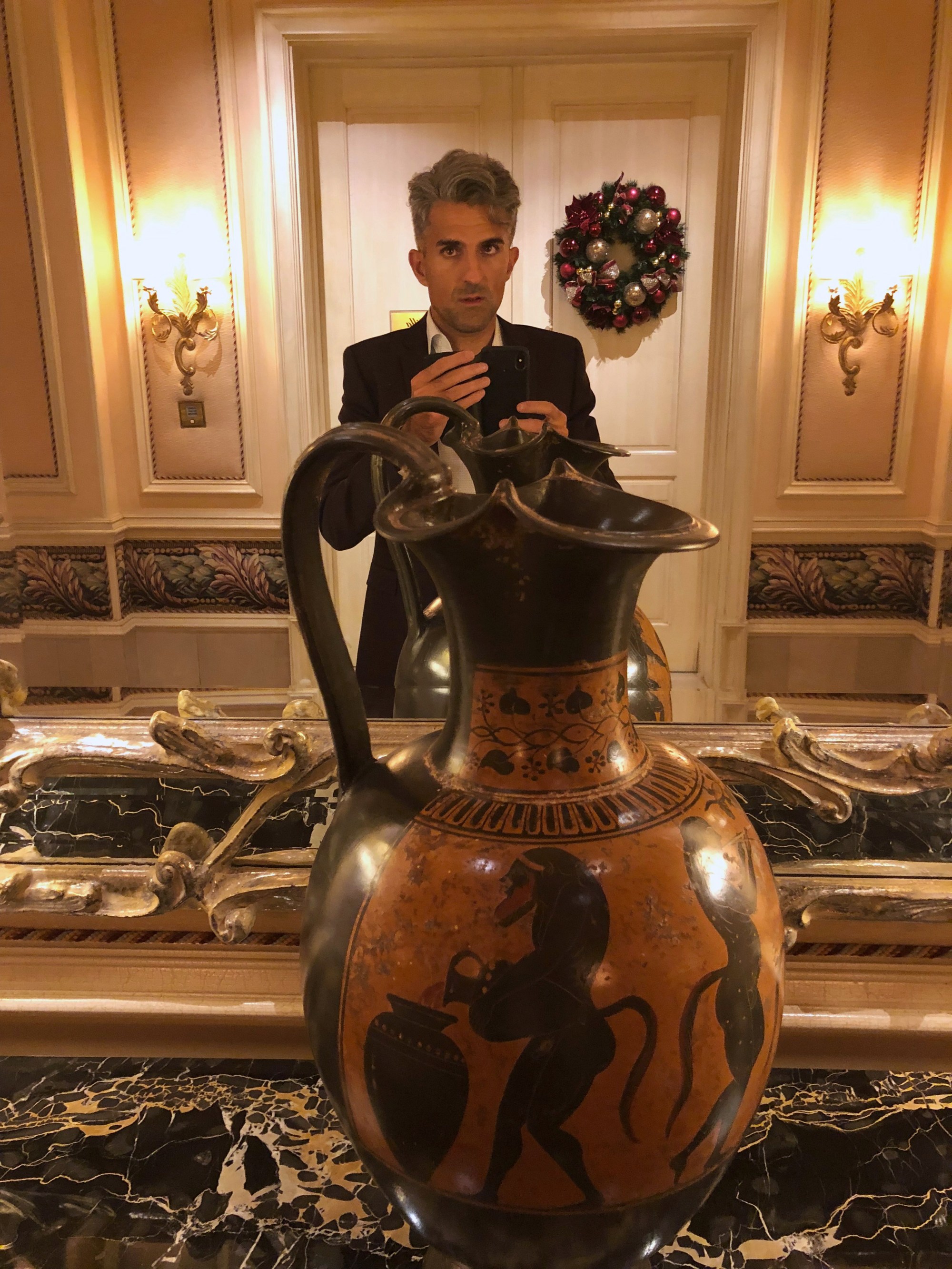 The Palace is loaded with colorful, contemporary art. Surrounding the entry door are two crystal Hermès Birkin bags, one filled with colorful glass butterflies, the other, real money.