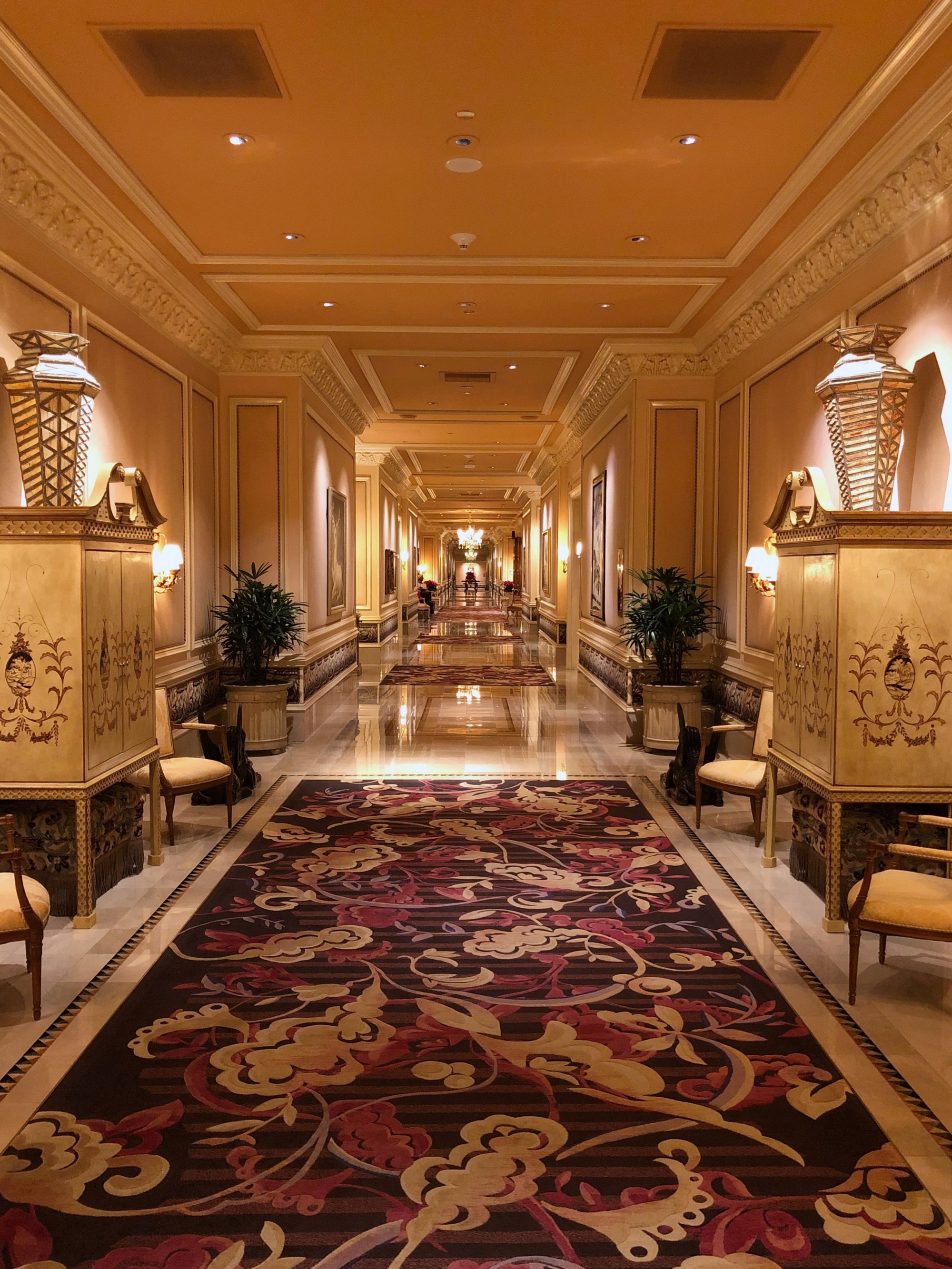 In truth, I was horribly underwhelmed. Villa hallways are supposed to be grand in scope, outrageous in design. This was slightly fancier than Crockfords’s already ho-hum guest room hallways. As I continued to make my way down, I noticed a room labeled “Palace 1” with its double doors slightly ajar.