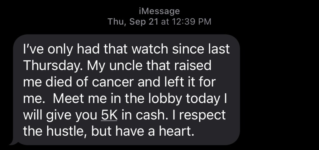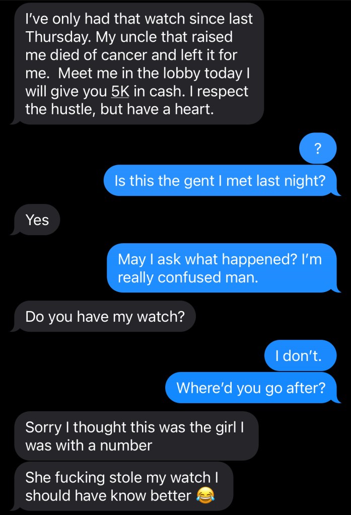 Was this a scam? If so, it was oddly specific. I couldn’t think straight. The concierge offered to have security escort me down. I figured that wouldn’t be necessary but thankfully ran into friends in the VIP Lounge downstairs and took a moment to collect my thoughts.